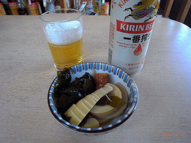 冷蔵ケースから缶ビールを取り、女将さんが手作りの肴を出してくれました。